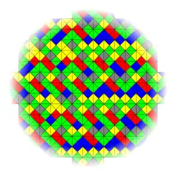 - Het principe van de wang-betegeling kan men in de driedimensionale ruimte toepassen met wang-kubussen, even grote kubussen waarvan elke zijde een bepaalde kleur heeft. Die worden zodanig in de ruimte gestapeld dat kubussen elkaar steeds met dezelfde kleur moeten raken. Hiervoor zijn ook verzamelingen van wang-kubussen bekend waarmee de ruimte alleen niet-periodiek kan worden gevuld.[5] Wang-tegels en -kubussen hebben toepassing gevonden in 2D- en 3D-computergraphics voor bijvoorbeeld snelle textuurmapping.[6][7][8]
