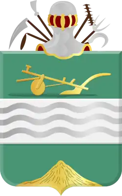 Van sinopel, beladen met eene golvende fasce van zilver, verzeld en chef met een ploeg en en pointe met een berg van hooi, alles van goud.[1]