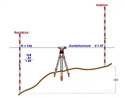 Vervolgens wordt de baak op een volgende te waterpassen punt geplaatst en afgelezen (de "voorbaak"). Het hoogteverschil tussen de twee meetpunten kan bepaald worden uit het verschil in afgelezen hoogte in die punten: hoogte vast punt + aflezing achterbaak - aflezing voorbaak = hoogte volgende punt. De aflezingen worden op een gestandaardiseerd waterpasformulier genoteerd. (Op dit formulier kan ook de som van alle achterbaakaflezingen en de som van alle voorbaakaflezingen bepaald worden. Het verschil van deze twee waarden geeft direct het hoogteverschil tussen begin- en eindpunten, dit als controle op de hoogteberekening van alle tussenpunten.) Vervolgens kan het instrument verplaatst worden, opnieuw opgesteld en een nieuwe aflezing wordt gedaan, nu met als "achterbaak" hetzelfde punt als de "voorbaak" van de vorige meting. Deze manier van waterpassen heet een "doorgaande waterpassing". Ter controle kan de waterpassing nóg eens gedaan worden, van het eindpunt terug naar het beginpunt. Het hoogteverschil moet dan op 0 (nul) uitkomen. Deze manier van waterpassen heet een "heen- en teruggaande waterpassing". Een eventueel hoogteverschil ("sluitfout") wordt evenredig over de tussenliggende punten verdeeld, het zogenaamde "vereffenen".
