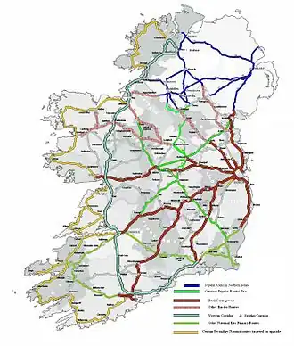 Wetgeving uit de periode voor de onafhankelijkheid, de "Ministry of Transport Act, 1919",[9] stond aan de wieg van de huidige regelgeving van het verkeersnet in Ierland. De wet gaf de Minister van Binnenlandse Zaken het recht wegen te classificeren als hoofdverkeerswegen ("Trunk Roads"). Het "Trunk Roads Fund" maakte het mogelijk dat lokale besturen initiatieven namen om de belangrijke wegen te verbeteren en te verharden. De meeste inspanningen op dit gebied vonden plaats in de jaren twintig en dertig.