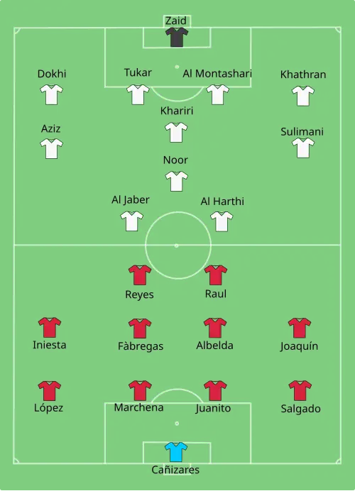 opstellingen | Santiago Cañizares Michel Salgado Carlos Marchena David Albelda Antonio López Andrés Iniesta Joaquín Juanito |