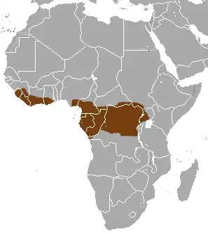 De soort komt voor in West- en Centraal-Afrika. De natuurlijke habitat zijn vochtige subtropische of tropische laaglandbossen, vochtige savanne en rotsachtige gebieden.