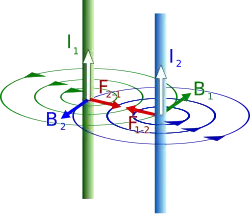 Een gevolg van de wet van Ampère is een kracht tussen twee naburige geleiders. Twee geleiders beïnvloeden elkaar. De opgewekte magnetische flux rondom een stroomvoerende draad is evenredig met de elektrische stroom door die draad, waarbij evenwijdige en gelijkgerichte elektrische stromen elkaar aantrekken, tegengesteld gerichte stromen elkaar afstoten.