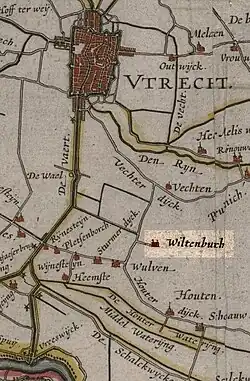De locatie voor de Wiltenburg werd in de loop van de geschiedenis geplaatst in of bij het (voormalig) Romeinse castellum Traiectum, de huidige Utrechtse binnenstad.[9][10] Daarbij wordt voor de burcht ook gedacht aan de locatie in of bij het castellum Fectio in het nabijgelegen Vechten.[11][12] In de 17e-eeuwse atlas Toonneel des Aerdrycks van Willem en Joan Blaeu staat een korte beschrijving over het slot Wiltenburg en wordt de burcht op kaarten gesitueerd binnen de driehoek tussen Vechten, Wulven en Houten,[13] in de buurt van het huidige bos Nieuw Wulven.