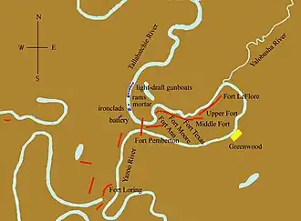 Ondertussen zaten de Zuidelijken niet stil. Luitenant-generaal John C. Pemberton gaf het bevel aan generaal-majoor William W. Loring om de opmars van de Noordelijken te stoppen. Hij stuurde werkploegen eropuit om de Yazoo Pass en Coldwater River te blokkeren. Op verschillende plaatsen hakten ze bomen om en lieten ze de bomen in het water vallen. Dit hield de Noordelijken niet tegen. De genie kon deze ongemakken snel opruimen. Ondertussen bouwde Loring een fort aan de samenvloeiing van de Tallahatchie en Yalobusha. Het fort werd opgebouwd uit katoenbalen die ze met aarde bedekten. Bovenop installeerden ze twee kanonnen. Deze constructie werd Fort Pemberton of Fort Greenwood genoemd. Naast dit fort had Lering verschillende batterijen opgesteld langs de Yalobusha. Hij liet ook een schip tot zinken brengen om de waterweg te blokkeren.