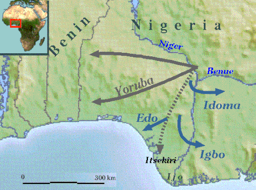 Bij gebrek aan geschreven bronnen wordt wel met vergelijkende taalstudie geprobeerd te schatten in welke tijd volkeren in West-Afrika zich van elkaar zijn gaan onderscheiden. De studies van J. Greenberg worden vaak genoemd. Hij onderscheidde een oostelijke Kwagroep onder de Afrikaanse talen. Hieronder vallen de Yoruba/Igalagroep, de Nupegroep, de Edo, de Idomagroep, de Igbo en de Ijo, of Ijaw. De Tiv, Jukun en de Ibibio spreken talen die tot de zogenaamde Benue-Kongogroep behoren. Het onderscheid tussen deze twee groepen talen is niet heel scherp.