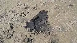 - ↑ Het slib manifesteert zich als zwarte blubber die veel gasbellen loslaat wanneer er in gewaad wordt. Er zijn borden met uitleg over veilige looproutes geplaatst met foto's van laag en hoogtij ter illustratie.