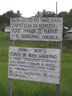 In de gebieden die ze onder hun beheer hebben staan zijn sinds 2003 juntas de buen gobierno (comités van goede regering) gevestigd, waar 'de bevolking beveelt en de regering gehoorzaamt. De oprichting van deze bestuursstructuur was nodig om voor de buitenwacht duidelijk te maken wie er wel een zapatista is en wie niet, en opdat 'de macht van het geld weet wie ze moet vrezen'. De juntas bestaan uit afgezanten van de autonome dorpsraden en worden gecontroleerd door het CCRI.[19] De zapatistas voeren in het door hen bestuurde deel van Chiapas een stringent antidrugsbeleid. Tegelijk beschuldigen zij de autoriteiten in de Mexicaanse politiek en het leger van bescherming van de drugsmaffia. Zij spreken van de "Colombianisering" van Mexico.