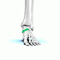Ziekte van Köhler bij een 8 jaar oud meisje. Bij het pijltje is te zien dat het bot bijna verdwenen is. (Vergelijk de andere, gezonde voet.) | ||||