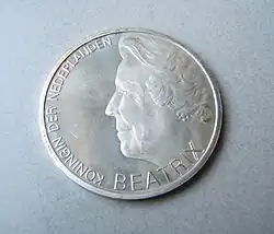 - Voorzijde: twaalf ellipsvormige ringen met klein portret koningin Beatrix daarboven.