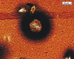 Door radioactief verval vrijkomende alfadeeltjes beschadigen het kristalrooster van het biotiet, waardoor een pleochroïsche halo ontstaat.