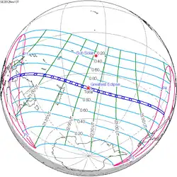 Het punt met maximale totaliteit lag op zee ver van enig land op coördinatenpunt 40.1955° Zuid / 160.3242° West en duurde 4m02,2s.