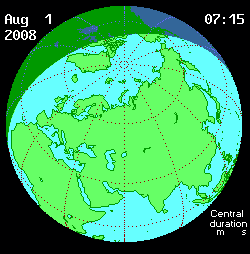 De totale zonsverduistering van 1 augustus 2008 trok veel over land en was achtereenvolgens te zien op of in deze negen (ei)landen: Canada, Groenland, Kvitøya, Frans Jozefland, Severnyeiland, Rusland, Kazachstan, Mongolië en China.[1][2]