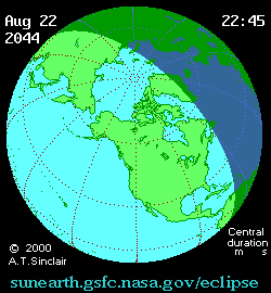 De totale zonsverduistering van 23 augustus 2044 trekt veel over land en is achtereenvolgens te zien in deze drie landen: Groenland (Denemarken), Canada en Verenigde Staten. [1][2] In de gebieden waar de eclips totaal is, vindt de totaliteit plaats wanneer de datum in de lokale tijd 22 augustus is.