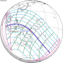 Het punt met maximale totaliteit ligt op zee ten zuidoosten van Papoea-Nieuw-Guinea op coördinatenpunt 10.279° Zuid / 151.7754° Oost en duurt 4m00,9s.