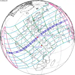 Het punt met maximale totaliteit ligt in Libië, vlak bij de steden Jalu en Awjilah, en duurt 5m15,1s.