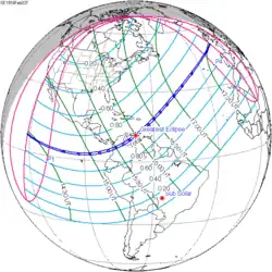 Het punt met maximale totaliteit lag op zee, vlak voor de kust van Venezuela bij de plaats Puerto Cabello, op coördinatenpunt 11.1217° Noord 67.6624° West, en duurde 2m36,2s.