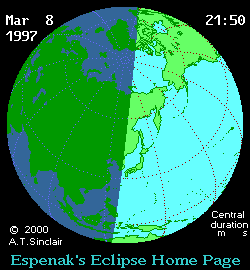 De totale zonsverduistering van 9 maart 1997 trok veel over land en was achtereenvolgens te zien in deze vier landen: China, Kazachstan, Rusland en Mongolië.[1][2]