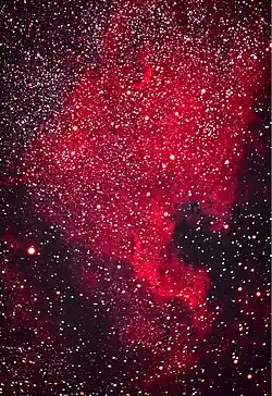 - De Noord-Amerikanevel (NGC 7000) heeft zijn naam te danken aan zijn buitengewone vorm, die op de kaart van het Noord-Amerikaanse vasteland (vooral de Golf van Mexico) lijkt. Hij kan, onder uiterst gunstige omstandigheden, met het blote oog worden waargenomen, als een heldere haak tegen de achtergrond van de Melkweg. De nevel ligt ten westen van de ster Deneb, op een afstand van zowat 1500 lichtjaar van de aarde.