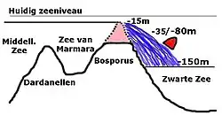 - Circa 10.000 v.Chr. was het glaciaal afgelopen en begonnen de oceanen weer te stijgen. Circa 7000 v.Chr. stonden ze op circa 35 meter onder het huidige niveau.[9] Dat is de tegenwoordige drempeldiepte van de Bosporus. Mogelijk begon toen het Middellandse Zeewater als een beekje de Zwarte Zee op te vullen. Maar de sapropeel (een zuurstofarme, zwarte modder) is pas 2000 jaar later ontstaan. Mogelijk is de oorzaak hiervan dat het (zwaardere) zoute water langzaam naar de bodem van het bekken is gezakt en pas 2000 jaar later anoxisch (zuurstofarm) werd hetgeen leidde tot de vorming van sapropeel.[10]