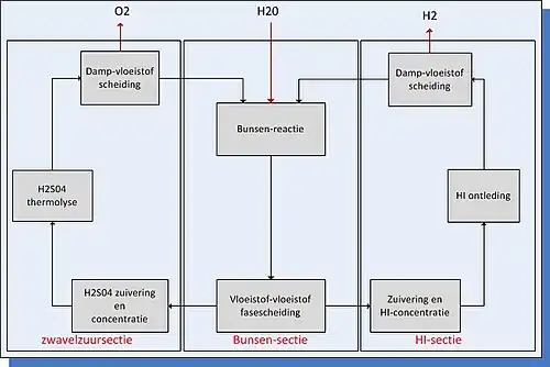 Het reactieproduct is een mengsel van water, zwavelzuur, di-jood en waterstofjodide, dat uit twee niet-mengbare vloeistoffasen bestaat; een die rijk is aan zwavelzuur en een die rijk is aan HI en I2. Deze worden gescheiden en afzonderlijk behandeld in de zwavelzuursectie en de HI-sectie: